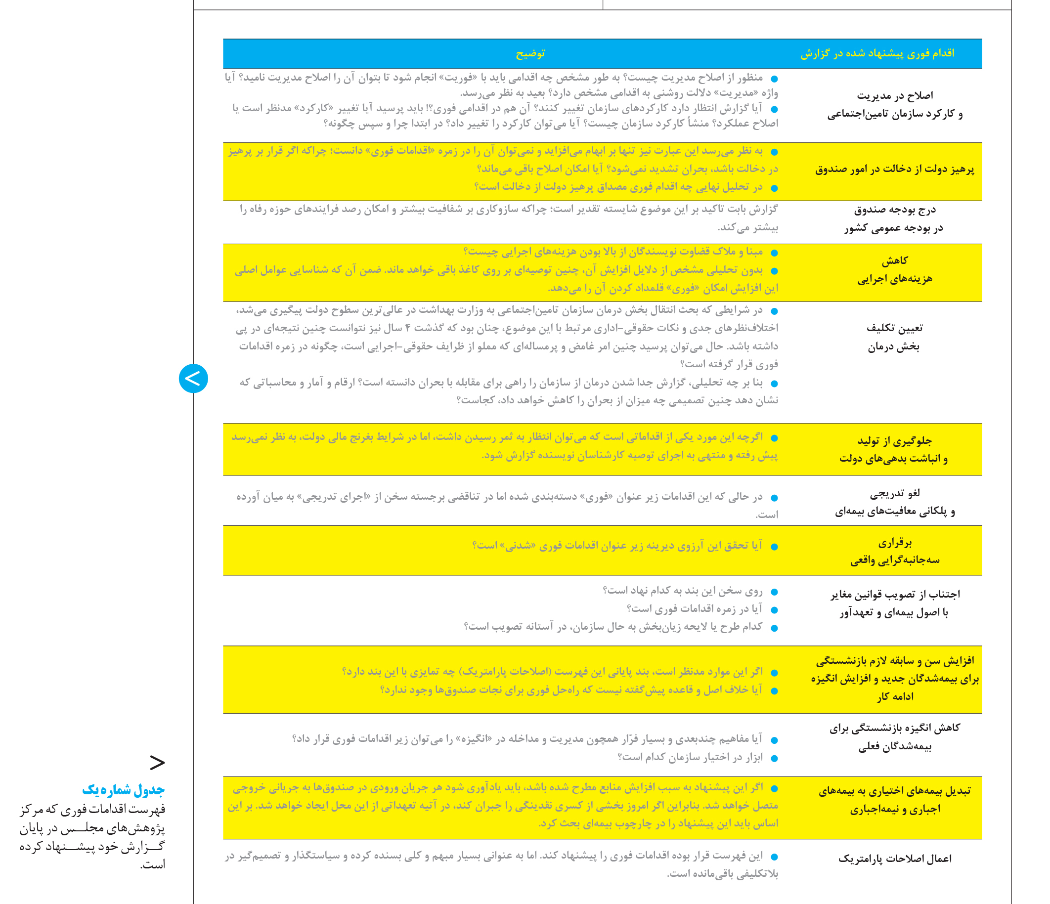 اگرچه در بخش تجارب و ادبیات، گزارش بر فقدان راهحلهای فوری و فوتی اذعان دارد، اما در صفحههای بعد زیر عنوان «اقدامات فوری» فهرست مفصلی از اقدامات را پیش کشیده است (جدول شماره یک).