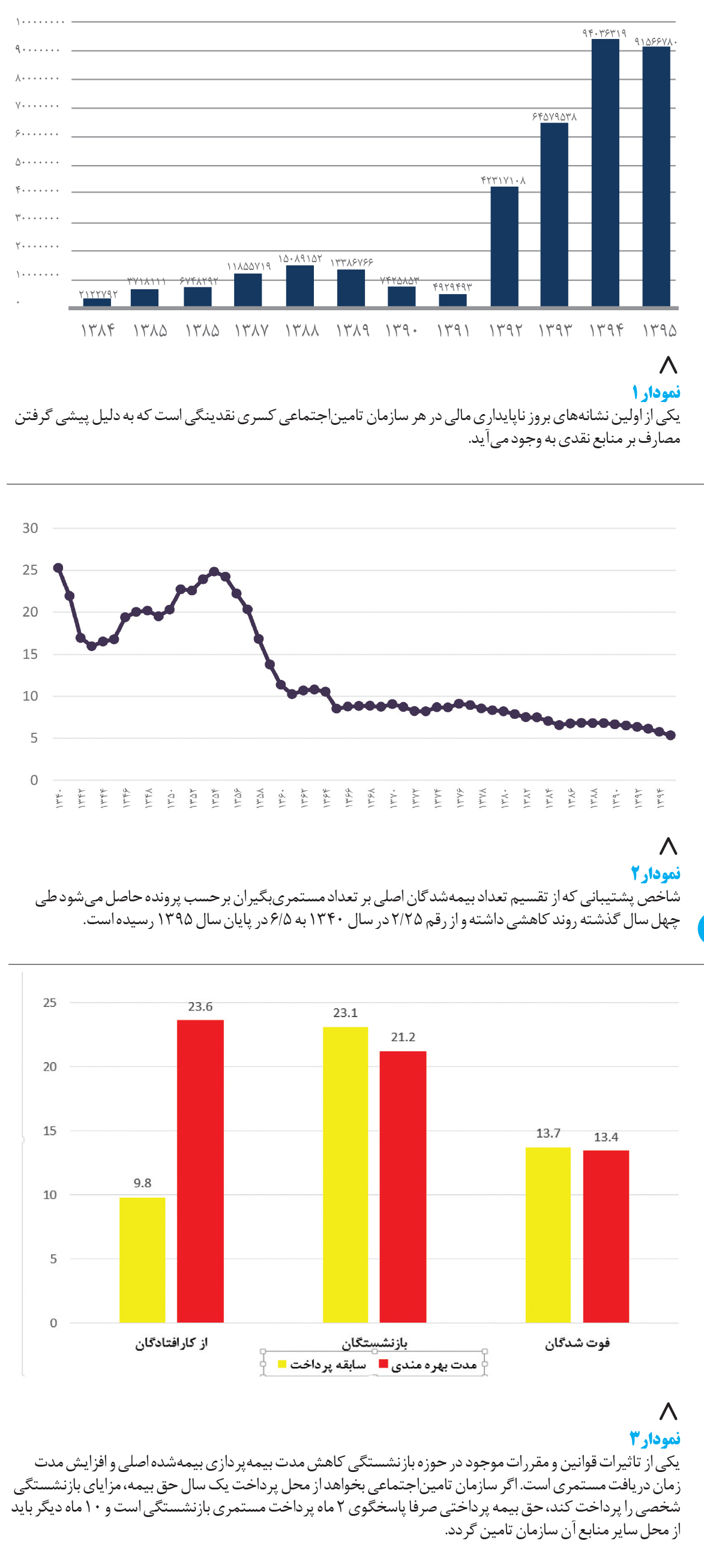 مدت بیمهپردازی: یکی از تاثیرات قوانین و مقررات موجود در حوزه بازنشستگی کاهش مدت بیمهپردازی بیمهشده اصلی و افزایش مدت زمان دریافت مستمری است. به طوری که متوسط سابقه بیمهشدگان اصلی سازمان تامیناجتماعی در زمان بازنشستگی ۱/۲۳ سال است. از کارافتادگان به طور متوسط ۹/۸ سال و فوتشدگان به طور متوسط ۷/۱۳ سال حق بیمه پرداخت کردهاند. اما در مقابل بازنشستگان با احتساب بازماندگانشان ۲/۲۱ سال مستمری دریافت میکنند. متوسط دریافت ۲۱ درصد (معادل یکپنجم) حقوق و مزایای خود را به منظور برخورداری از تعهدات بلندمدت به سازمان تامیناجتماعی پرداخت، اما در زمان بازنشستگی با احتساب مزایا، ۱/۲ برابر حقوق و مزایای پرداختی را از سازمان تامیناجتماعی دریافت میکنند. به عبارت سادهتر اگر سازمان تامیناجتماعی بخواهد از محل پرداخت یک سال حق بیمه، مزایای بازنشستگی شخصی را پرداخت کند، حق بیمه پرداختی صرفا پاسخگوی ۲ ماه پرداخت مستمری بازنشستگی است و ۱۰ ماه دیگر باید از محل سایر منابع آن سازمان تامین گردد (نمودار شماره ۳).