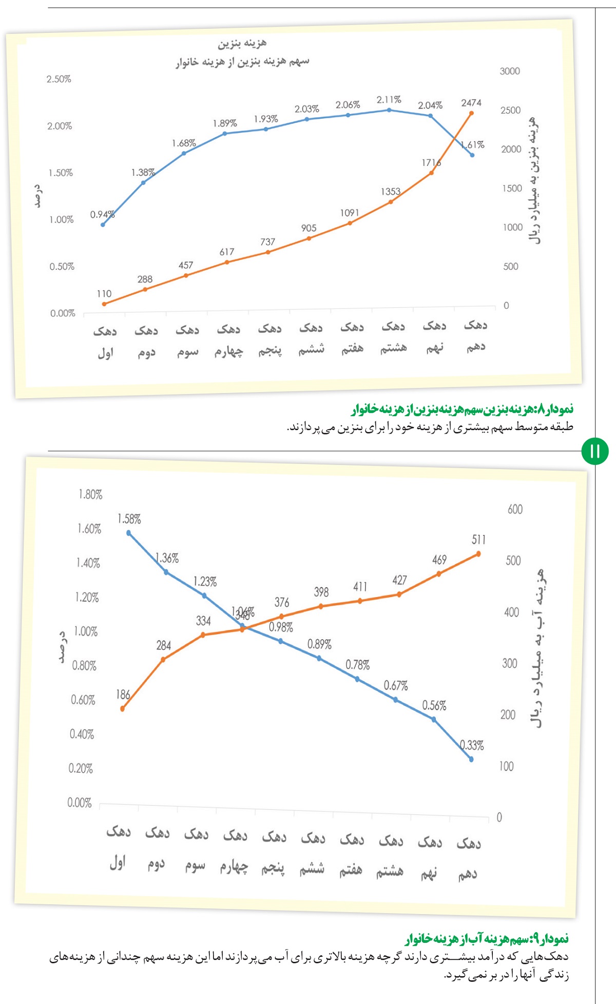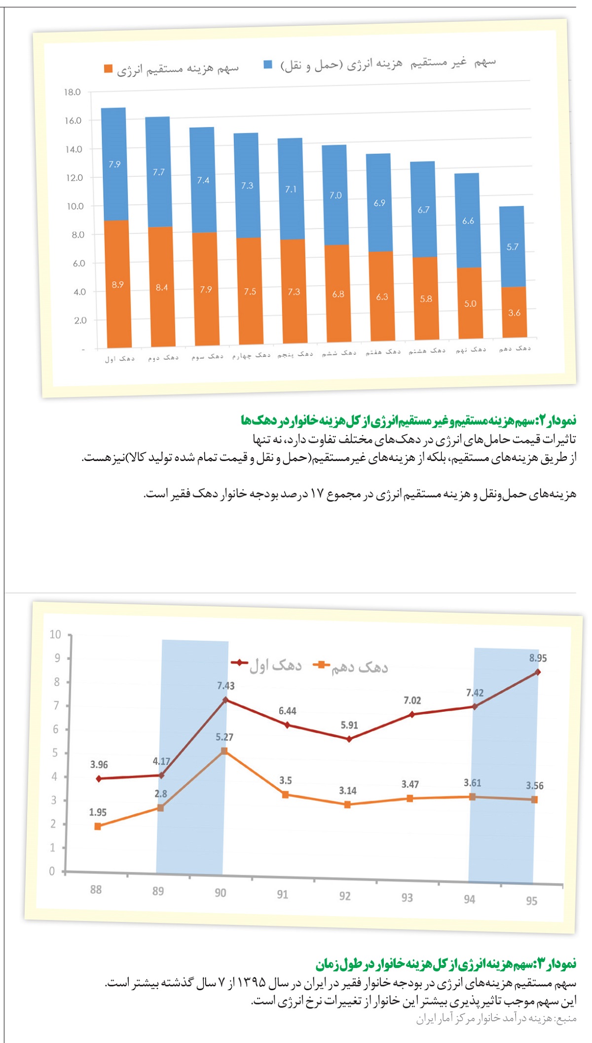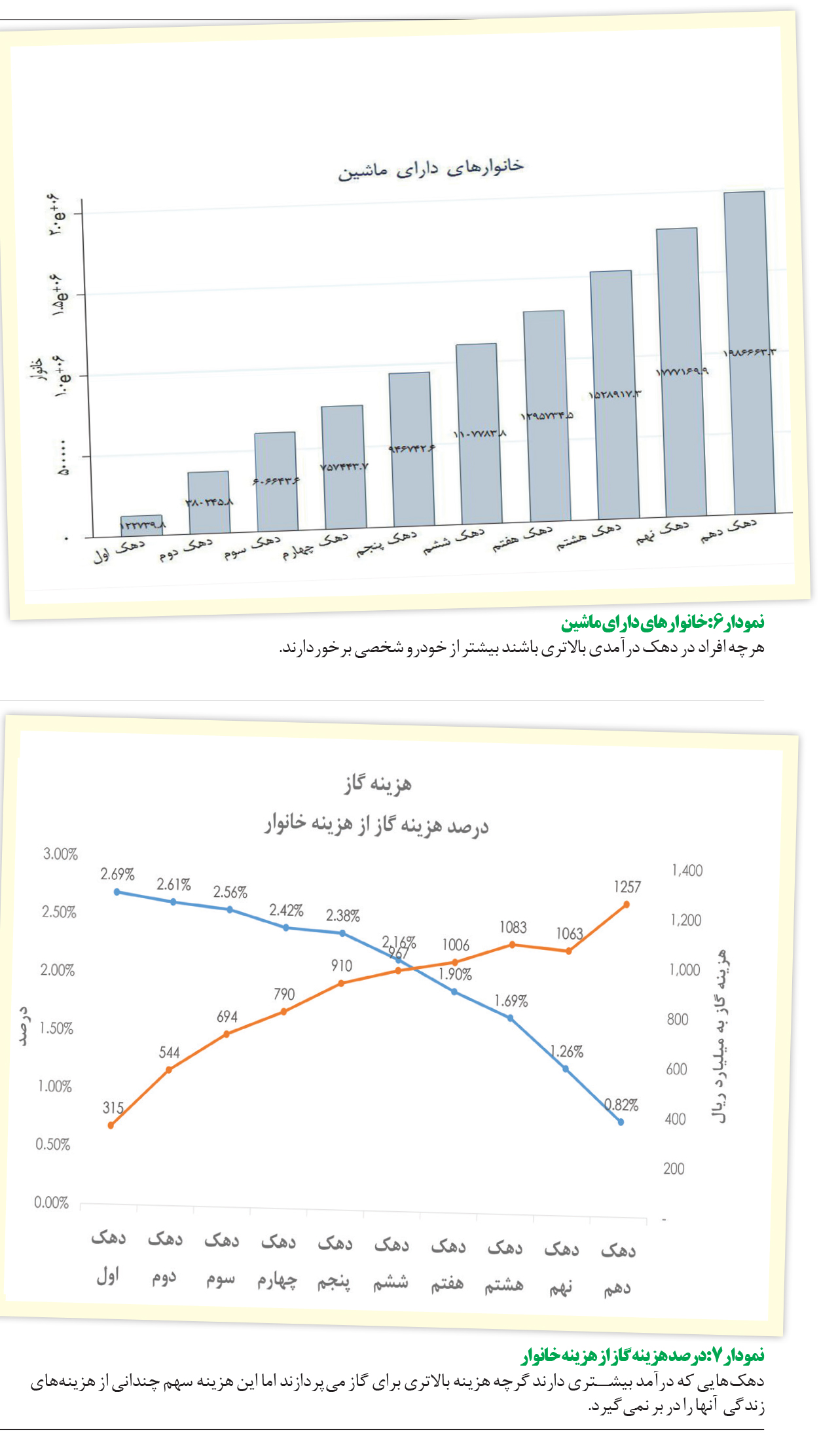 اگر هر دهک قرار بود متناسب با جمعیت خود از منابع انرژی استفاده کند میبایست هر دهک ۱۰ درصد از انرژی کشور را استفاده میکرد، اما طبق بررسی انجام شده ۲۷ درصد از مجموع هزینههای انرژی (یعنی معادل یارانههای انرژی)، سهم دهک دهم یعنی ثروتمندترین دهک جمعیتی است و دهک اول یعنی فقیرترین دهک، از کل این بازار فقط ۲/۴ درصد است. یعنی دهک فقیرتر، ۶۰ درصد کمتر از سهم جمعیتی خود بابت انرژی میپردازد. از سوی دیگر، با توجه به اینکه درآمد دهک دهم بسیار بیشتر از دهک اول است، سهم ۲۷ درصدی هزینه انرژی کل کشور، برای این دهک چندان زیاد نیست و هزینه کمرشکن به حساب نمیآید. طبق همین محاسبه، فقط ۶/۳ درصد از هزینههای زندگی دهک ثروتمند صرف هزینههای انرژی میشود. به عبارت دیگر سهم ۲۷ درصدی هزینه کشور انرژی کشور، فقط ۶/۳ درصد از هزینه زندگی دهک دهم است، در حالی که این سهم در دهک فقر تقریباً ۹ درصد است. بنابراین بهرغم اینکه دهک اول انرژی کمتری را مصرف میکند، اما با توجه به کم بودن متوسط درآمد در این دهک، سهم بیشتری از درآمد خود را به انرژی اختصاص میدهد. به عبارت دیگر، بالا رفتن قیمت حاملهای انرژی، بیشتر به اقشار کمدرآمد آسیب میزند و قدرت خرید آنها را کاهش میدهد.