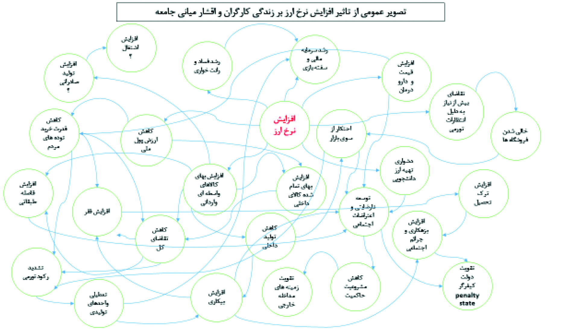 در نمودار شماره (۳) که توسط نگارنده تهیه شده، تصویر عمومی از تاثیرات افزایش نرخ ارز بر برخی متغیرها و شرایط اقتصادی، اجتماعی، سیاسی، امنیتی و... ارائه شده است. البته تعداد این متغیرها میتواند بسیار بیش از آنچه در نمودار تصویر شده، باشد. اما مساله مهم آن است که به این نکته توجه شود که تاثیر افزایش قیمت ارز در مدلی ساده رخ نمیدهد و تاثیرات بین آنها نیز تنها به خطوط و جهتهای ترسیم شده محدود نمیشود، بلکه در مدلی پیچیده با مجموعه بر هم موثری از متغیرها مواجه هستیم که به نوبه خود نیازمند مطالعه جداگانه و متمرکزی نیز هستند تا سازوکار تاثیرپذیری و تاثیرگذاری متقابل متغیرها به درستی مورد توجه قرار گیرند.