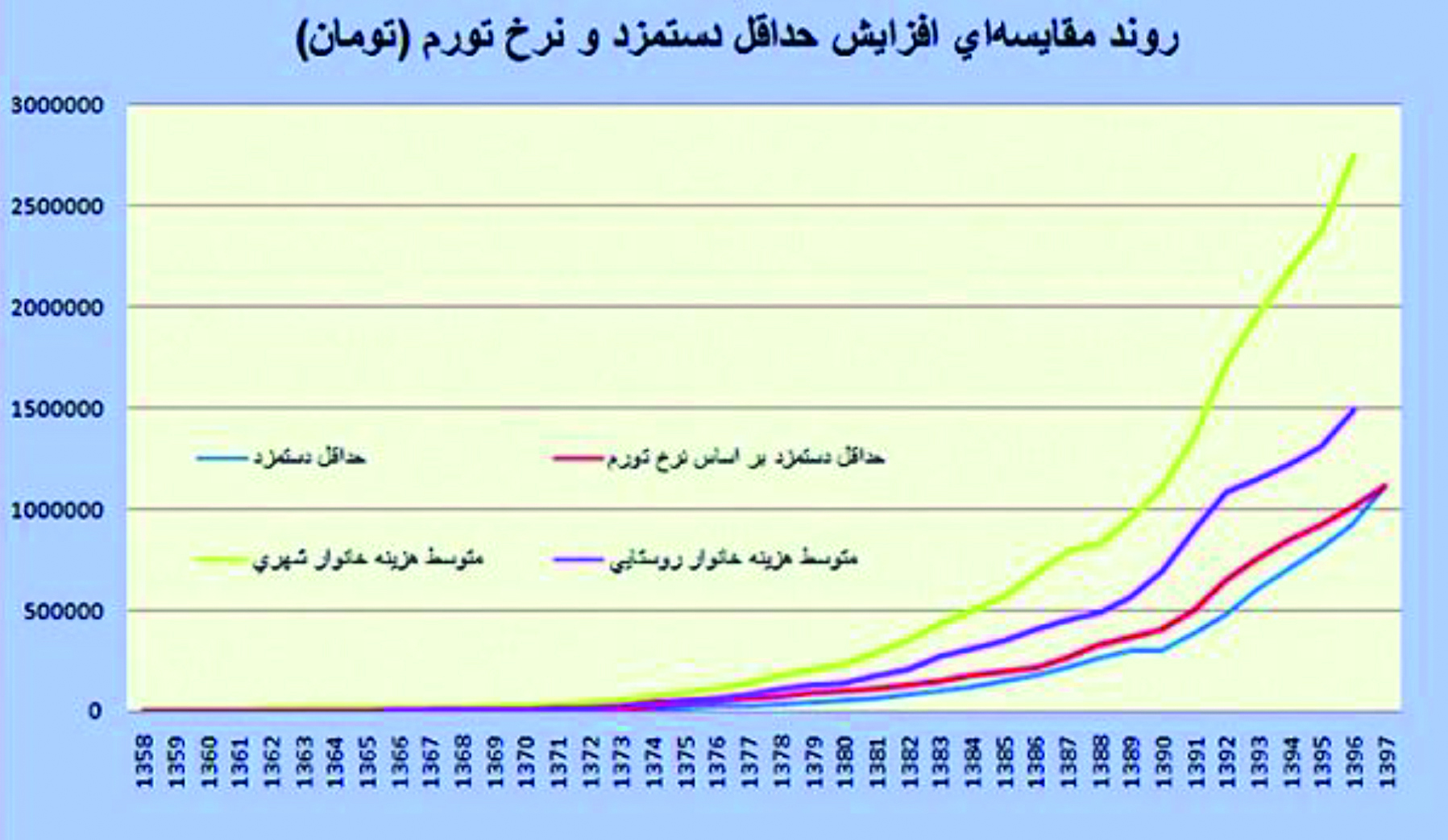 قابل توجه است که بر اساس شواهد موجود، در دولتهای مختلف تلاشهای متعددی مانند تغییر سال پایه و تغییر ضرایب اهمیت اقلام مصرفی خانوارها صورت گرفته تا برای نرخ تورم رقم پایینتری از میران واقعی آن محاسبه شود. با این وجود، بر اساس همین آمارهای رسمی نیز مشاهده میشود که حداقل حقوق کارگری اساسا همواره بسیار پایینتر از نرخ تورم و متوسط هزینه خانوارهای شهری و روستایی است.