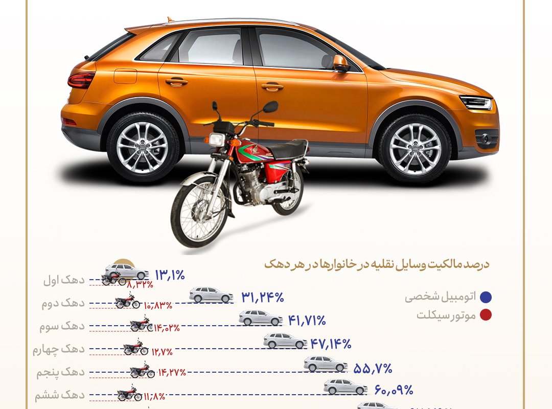 فقط 54 دصد از خانوادههای ایرانی ماشین دارند و داشتن اتومبیل یکی از نماگرهای مهم است که احتمال حضور فرد در دهکهای بالا را نشان میدهد با این وجود نمیتوان گفت که همه خانوارهای دهکهای بالا خودرو دارند.
