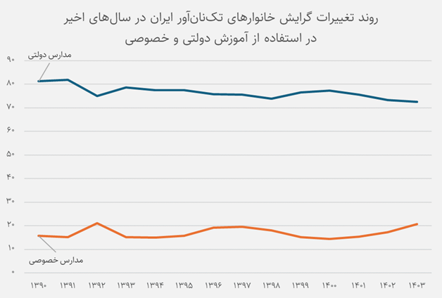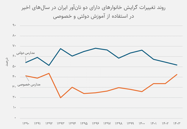 بررسی دادههای مربوط به انتخاب مدارس دولتی و خصوصی برای مقاطع پیش دبستانی و ابتدایی در بازه زمانی 1390 تا 1403 در دادههای هزینه و درآمد مرکز آمار نشاندهندهی فاصلهای پایدار میان خانوارهای تکنانآور و خانوارهای دارای دو سرپرست شاغل است.