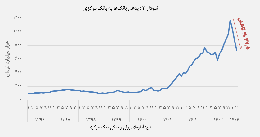 نکته جالب این است که اگر این کاهش بدهی اتفاق نمیافتاد، رشد پایه پولی در خرداد ۱۴۰۴ میتوانست به حدود ۶۹ % برسد و تورم شدیدتری ایجاد کند. بنابراین کنترل نسبی بدهی بانکها، بخش مهمی از تفاوت فضای اقتصادی امروز با سناریوی بحرانی را توضیح میدهد.