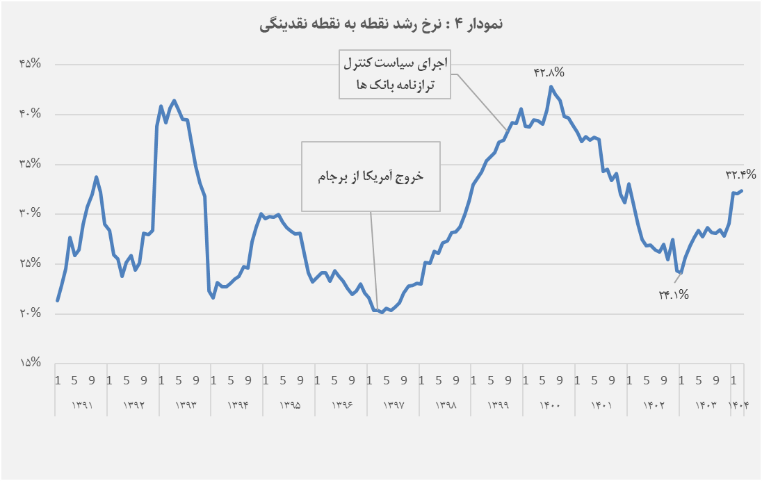 پس از یک دوره کاهش از اواخر سال 1401، رشد پایه پولی بار دیگر از مهر ۱۴۰۳ افزایشی شد و در خرداد ۱۴۰۴ به حدود ۳۰% رسید؛ یعنی حدود ۵ واحد درصد بیشتر از پایان سال قبل. مرور الگوی تغییرات پایه پولی از ۱۳۹۷ به بعد یعنی از زمان تشدید محدودیتهای بینالمللی و افزایش کسری بودجه دولت، بیانگر این است که رشد آن در کشور به طور پایدار مهار نشده و در چرخههای متوالی افزایش و کاهش گرفتار شده است. نکته مهمتر این است که سقفهای این چرخه هر بار جهشی شدیدتر داشتهاند ( به مقدار رشد در خرداد 1399، تیر 1400 و فروردین 1402 توجه کنید). این تغییرات فزاینده و پرنوسان، حکایت از شکنندگی محیط اقتصاد کلان و ناکارآمدی اقدامات کوتاهمدت در مهار فشارهای پولی دارد؛ اقداماتی که معمولاً بر محدودسازی برخی منابع خلق پول تکیه داشتهاند و به محض کمرنگشدن، دوباره رشد پایه پولی شدت گرفته است.