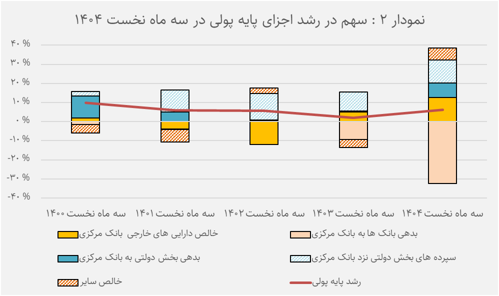 بررسی منابع رشد پایه پولی در سهماهه نخست سال تصویر روشنتری از وزن هر یک از این عوامل ارائه میدهد. تنها عاملی که در جهت کاهش پایه پولی حرکت کرده، بدهی بانکها به بانک مرکزی بوده که اثری کاهنده معادل ۳۲.۳ واحد درصد ثبت کرده است. در سمت دیگر ماجرا، خالص داراییهای خارجی بانک مرکزی بیشترین نقش افزایشی را در این دوره داشتهاند و حدود ۱۲.۵ واحد درصد به رشد پایه پولی اضافه کردهاند. سپردههای بخش دولتی نزد بانک مرکزی نیز با سهمی معادل ۱۱.۹ واحد درصد دومین عامل رشد بودهاند. علاوه بر این، افزایش بدهی دولت به بانک مرکزی ۷.۷ واحد درصد و خالص سایر اقلام ۶.۴ درصد از رشد پایه پولی را توضیح دادهاند. مجموع این اجزا نشان میدهند بهرغم کاهش نقش بانکها در خلق نقدینگی، دولت و بخش خارجی همچنان سهم اصلی را در افزایش پول پرقدرت ایفا میکنند.