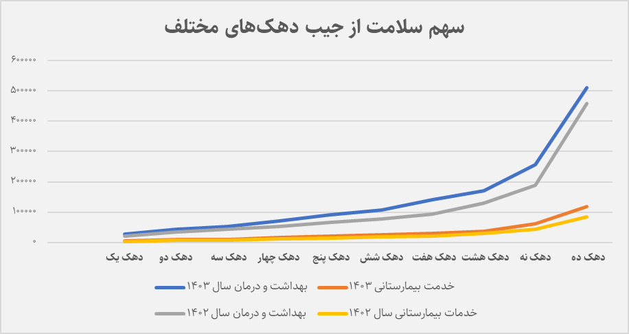 تفاوت میان دهکها نیز بیانگر تداوم نابرابری افقی در نظام سلامت ایران است. در سال ۱۴۰۳، هزینه بهداشت و درمان دهک دهم بیش از ۱۸ برابر دهک اول بود و در بخش خدمات بیمارستانی، این نسبت حدود ۲۵ برابر گزارش شده است. دهکهای بالا از خدمات تخصصی و بیمارستانی بیشتری استفاده میکنند و دهکهای پایین یا از دریافت خدمات بازمیمانند یا بخش بزرگی از درآمد خود را صرف درمان میکنند.