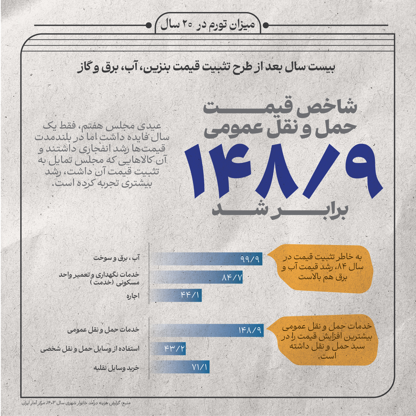 صفحه اصلی اینفوگرافی بیست سال بعد از عیدی مجلس هفتم رشد قیمتها بعد از تثبیت قیمت بنزین، آب، برق و بقیه کالا چقدر بوده است 31 اردیبهشت 1404 - 10:03 | اینفوگرافی در حالی که رشد قیمت مصرفی 83.2 بوده است، رشد آب، برق و بنزین و گازوییل در تورم چگونه بوده است؟ برچسبها تورم نرخ تورم