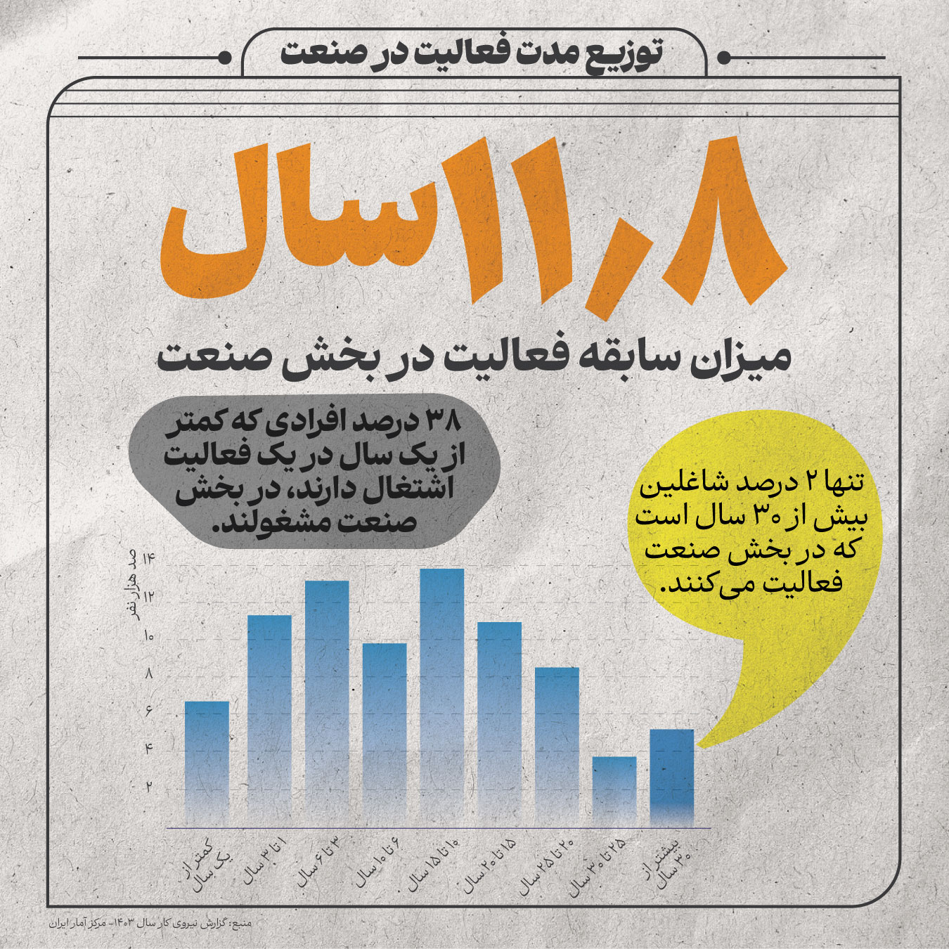 صفحه اصلی اینفوگرافی سابقه کار بخش صنعت چگونه است؟ میزان سابقه در بخش صنعت به طور میانگین 11.8 سال است 08 خرداد 1404 - 12:17 | اینفوگرافی برچسبها آمار اشتغال صنعت ایران کارگران صنعتی