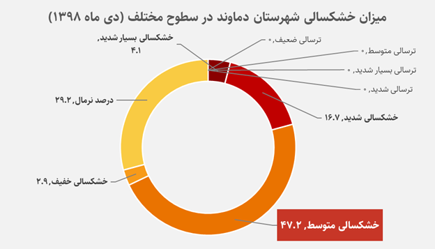 دادههای سال ۱۳۹۸ نشان میدهد که در آن زمان حدود 71% از مساحت دماوند تحت خشکسالی قرار داشته و خشکسالی متوسط با سهم ۴۷.۲% بیشترین نوع خشکسالی را شامل میشد و هیچ ترسالی در این ناحیه وجود نداشته است.
