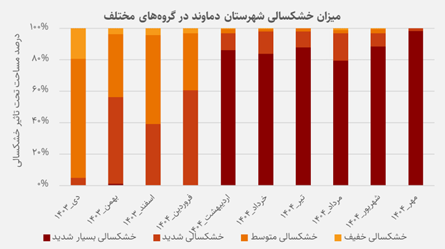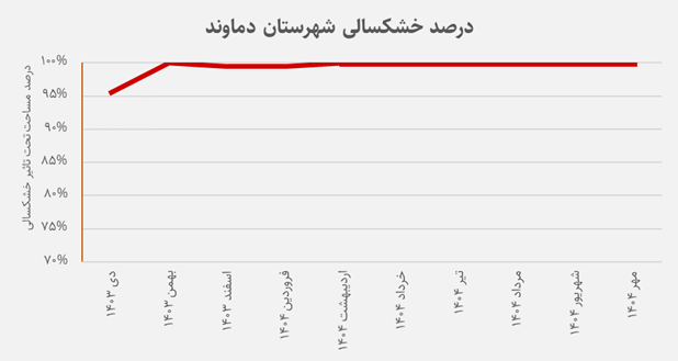 اما روند تغییرات ماههای اخیر تصویر متفاوتی ارائه میدهد. بر اساس دادههای مربوط به شاخصSPEI از دی ۱۴۰۳ تا مهر ۱۴۰۴، شدت خشکسالی در دماوند بهطور پیوسته افزایش یافته و با افزایشی 5 درصدی در ماههای ابتدایی این دوره به ۱۰۰% رسیده است. این روند پایدار نشان میدهد که بخش عمده شهرستان برای چند ماه متوالی درگیر خشکسالی بسیار شدید بوده است.