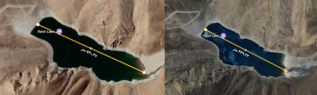 در کنار دادههای کمی، مقایسه تصاویر ماهوارهای سالهای 1398 (2019) و 1403 (2024) نیز روند کاهش سطح آب دریاچه را تأیید میکنند. تصویر سال 1398، که به عنوان سال مرجع در نظر گرفته میشود، دریاچه هویر را در گستردهترین وضعیت قابل مشاهده نشان میدهد.