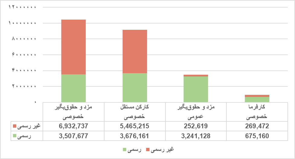 در سوی دیگر، کارفرمایان که فقط 3.8% نیروی کار کشور را شامل میشوند، بالاترین میزان رسمی بودن را در بخش خصوصی داشته و 71.5% آنها رسمیاند.