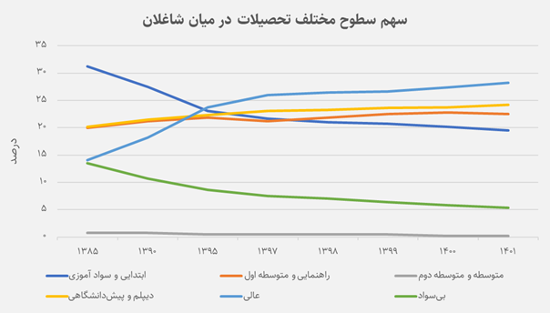 در ابتدای دورهی موردبررسی، بخش عمدهی شاغلان کشور را افرادی با تحصیلات ابتدایی، راهنمایی یا متوسطه تشکیل میدادند. این وضعیت بازتاب ساختار اقتصادی و اجتماعی ایران در دههی ۱۳۸۰ بود؛ دورهای که هنوز بخشهای سنتی، کشاورزی و مشاغل کممهارت سهم بالایی در اشتغال داشتند. بااینحال، از میانهی دههی ۱۳۹۰ به بعد، روندی متفاوت شکل میگیرد. سهم شاغلان دارای تحصیلات دانشگاهی به طور پیوسته افزایش مییابد و فاصلهی آن با سایر سطوح تحصیلی بیشتر میشود.