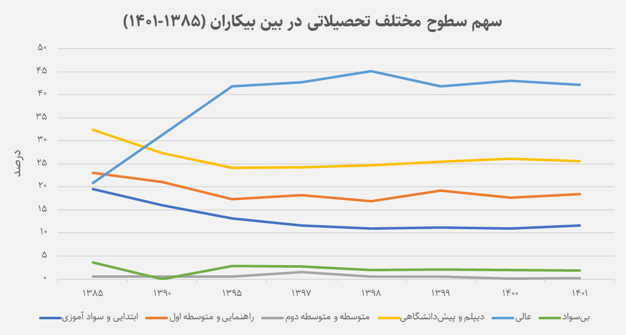در بررسی ترکیب تحصیلی بیکاران، یک تغییر قابلتوجه دیده میشود: سهم افراد دارای تحصیلات دانشگاهی در میان بیکاران روبهافزایش است. به بیان دیگر، بیکاری بیش از گذشته به سمت تحصیلکردهها متمایل شده و مرکز ثقل آن از گروههای کمسواد به جمعیت دانشگاه رفته نزدیکتر شده است. این روند معمولاً با شکاف میان تعداد فارغالتحصیلان و ظرفیت جذب بازار کار توضیح داده میشود.