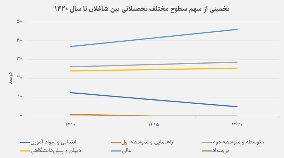 در مقابل، سهم شاغلان بیسواد یا دارای تحصیلات ابتدایی کاهش چشمگیری داشته است. سهم این گروه از حدود ۴۰% در سال ۱۳۸۵ به کمتر از ۱۵% در سال ۱۴۰۱ رسیده و پیشبینی میشود تا سال ۱۴۲۰ به نزدیک ۵% کاهش یابد. این روند، بازتاب مستقیم گسترش آموزش عمومی، افزایش نرخ باسوادی و بهبود دسترسی به تحصیل در مناطق شهری و روستایی است. جامعهی ایران در این سالها به طور محسوسی از بیسوادی فاصله گرفته و این تغییر، خود را بهوضوح در ترکیب شاغلان نشان میدهد.
