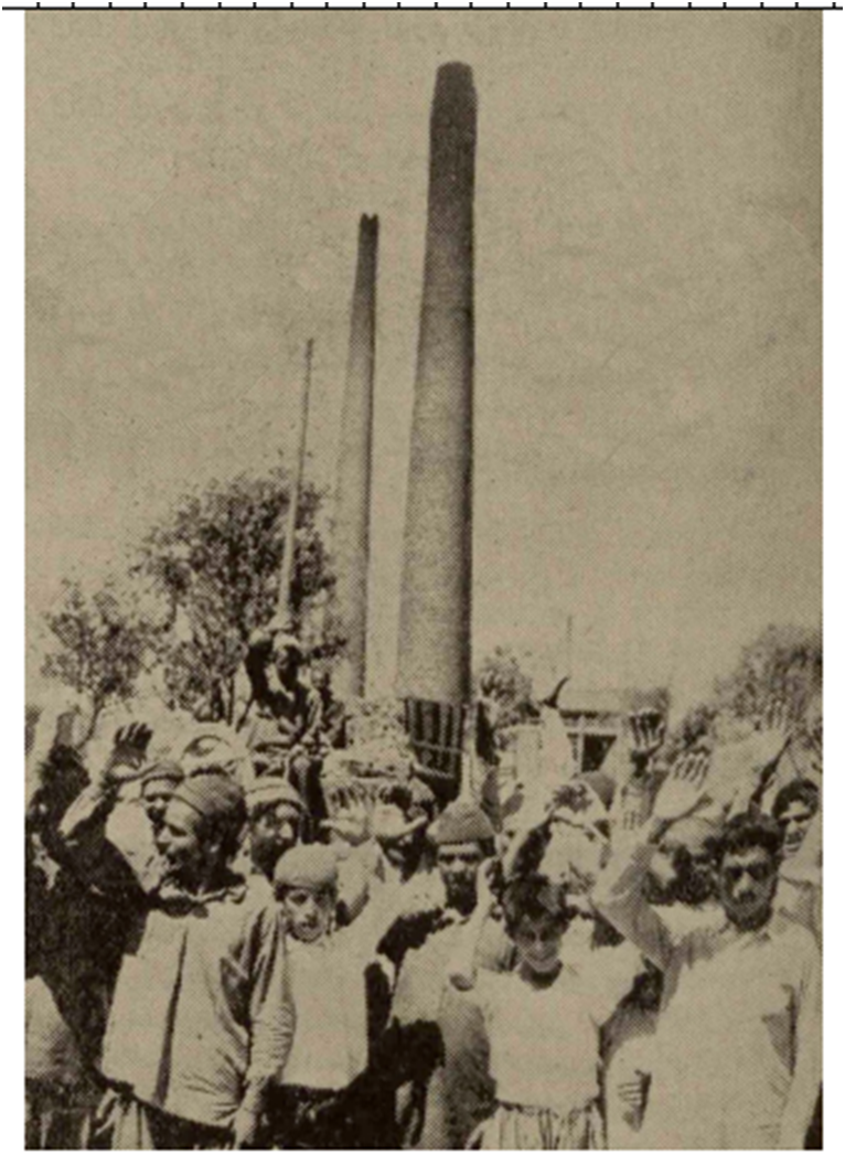 شکل ۲- کارگران آجرپزی خاتونآباد در اعتصاب، ۱۹۵۷. منبع: کتابخانه، موزه و مرکز اسناد مجلس شورای اسلامی، «کارگران کورهپزخانههای تهران، اعتصاب کردند»، کیهان، شماره ۴۲۰۸ (۹ تیر ۱۳۳۶/۳۰ ژوئن ۱۹۵۷).