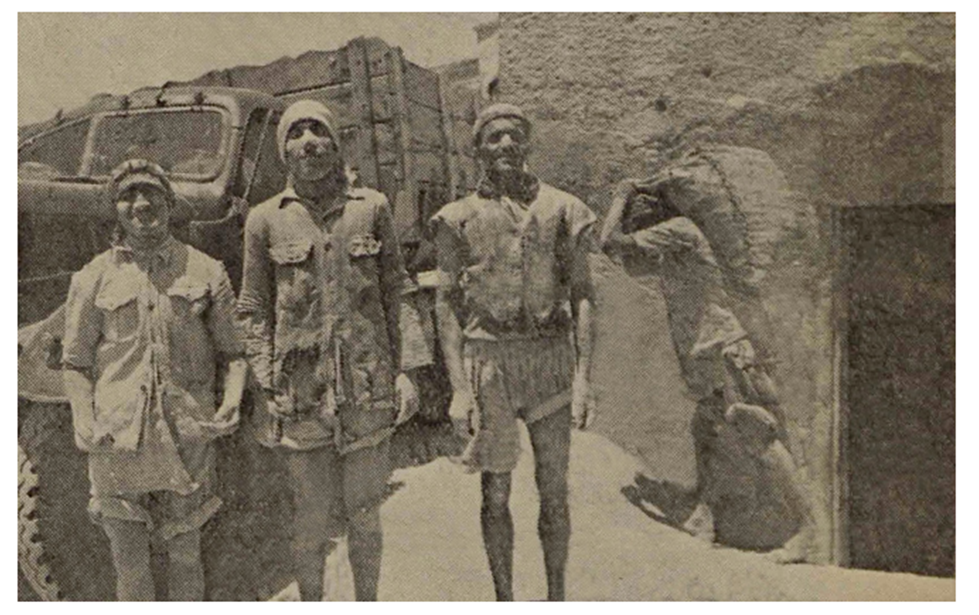 شکل ۱ آجرکاران خاتون آباد، ۱۹۵۶. منبع: کتابخانه، موزه و مرکز اسناد مجلس شورای اسلامی، «کوره ها: صد هزار نفر در اینجا تا جان داشته باشند جان میکنند» کیهان، شماره. ۳۸۸۱ (۷ خرداد ۱۳۳۵/۲۸ مه ۱۹۵۶)، ۶.