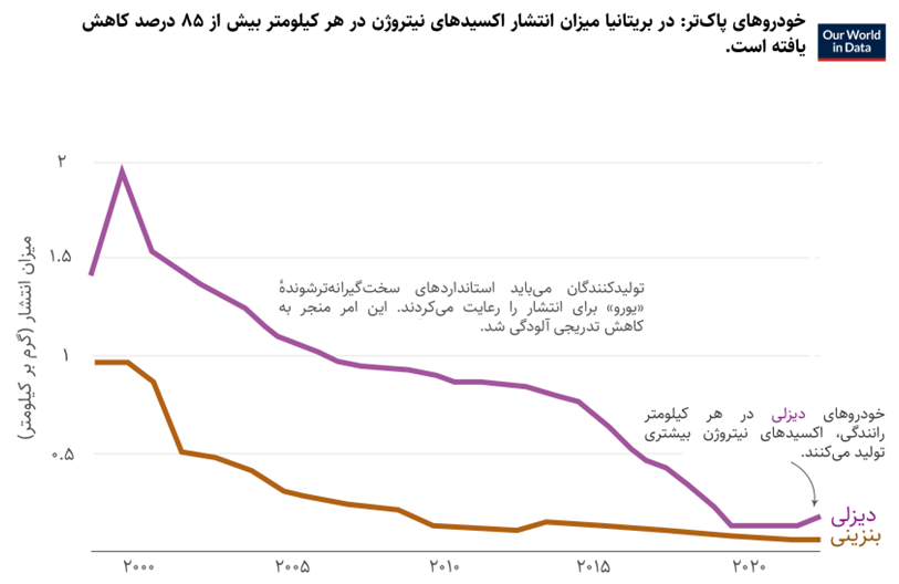 شکل 3 نشان میدهد که از سال ۱۹۹۸ در بریتانیا بهازای هر یک کیلومترِ پیمودهشده با خودروهای دیزلی و بنزینی چه میزان از اکسیدهای نیتروژن تولید شده است. خودروهای دیزلی هنوز در مقایسه با مدلهای مشابه بنزینی برای آلودگی محلی هوا مضرتر هستند. ولی انتشار ناشی از هر یک از دو نوع سوخت، کمتر از ۱۵٪ میزان انتشارشان در سالهای پایانی دههٔ ۱۹۹۰ است.