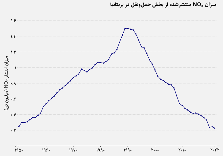 شکل ۱ نشان میدهد که انتشار اکسیدهای نیتروژن ناشی از بخش حملونقل در بریتانیا از سال ۱۹۵۰ تا امروز چه مسیری را طی کرده است. منحنی یک الگوی متقارن دارد: از دههٔ ۱۹۸۰ با شیبی تند بالا میرود، حوالی ۱۹۹۰ به اوج میرسد و بعد وارد مسیر کاهش میشود؛ در سالهای اخیر نیز، میزان انتشار حتی از سطح ۱۹۵۰ هم پایینتر آمده است