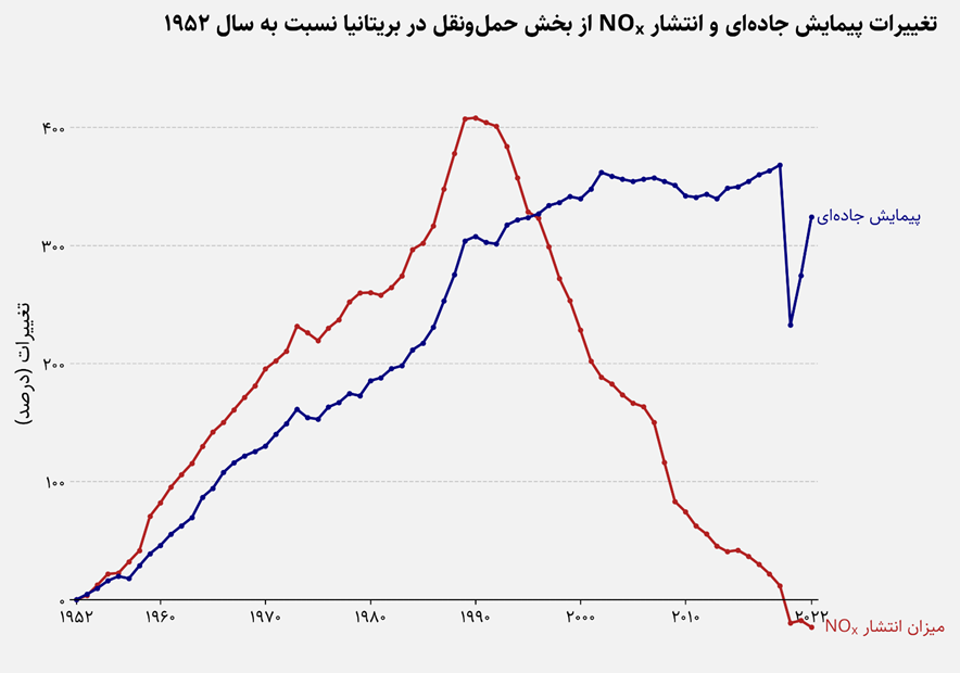 افزایش سریع اکسیدهای نیتروژن با افزایش میزان رانندگی در جادههای بریتانیا همزمان بوده است. از ۱۹۵۲ تا ۱۹۹۰، مسافت پیمودهشده با خودروهای شخصی، اتوبوسها، کامیونها و موتورسیکلتها در حدود ۳۰۰٪ افزایش یافت. این روند فزاینده در شکل 2 قابلمشاهده است. دو منحنی تغییرات نسبی پیمایش جادهای (با رنگ آبی) و انتشار اکسیدهای نیتروژن ناشی از حملونقل (با رنگ قرمز) در بریتانیا را از سال ۱۹۵۲ نمایش میدهند.