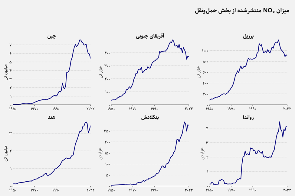 بر اساس دادههای مربوط به میزان آلایندههای نیتروژنی منتشرشده از بخش حملونقل، کشورهای با درآمد کم تا متوسط هنوز خیلی از این وضعیت عقبتر هستند. برخی از آنها، از جمله چین، آفریقای جنوبی و برزیل، نقطهٔ اوج میزان انتشار اکسیدهای نیتروژن را گذراندهاند. در بعضی کشورهای با درآمد کم یا متوسط، مانند هند، بنگلادش و رواندا، میزان رشد انتشار این آلاینده در حال کاهش است. این مشابه همان الگویی است که در بخش اول مقاله در مورد SO2 مشاهده شد.