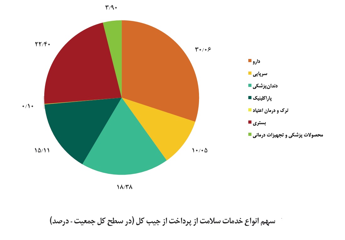 بررسی سهم انواع خدمات سلامت از پرداخت از جیب کل نشان میدهد داروها با احتساب 30 درصد، بیشترین سهم از پرداختهای مستقیم از جیب را در سال گذشته به خود اختصاص دادهاند. در رتبهی دوم و سوم بستری و خدمات دندانپزشکی با 22 و 18 درصد قرار دارند.