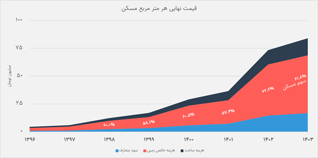 روند طی شده نشان میدهد مسکن در ایران از یک نهاد تولید و یک کالای مصرفی به یک رانت تغییر ماهیت داده است. بهطوریکه در سال ۱۴۰۳، سهم زمین در قیمت نهایی نزدیک به ۳.۵ برابر سهم کل فعالیتهای ساختمانی و مهندسی بوده است.