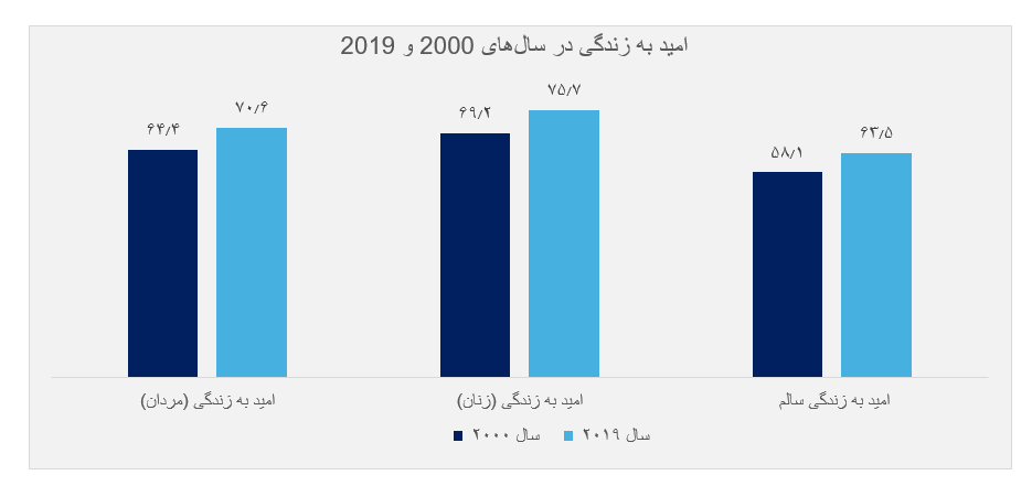 بین سالهای ۲۰۰۰ تا ۲۰۱۹، جهان شاهد جهشی در شاخصهای طول عمر بود. بدین ترتیب که امید زندگی در بدو تولد با افزایشی ۶.۳ سالی، از ۶۶.۸ سال به ۷۳.۱ سال رسیده و امید زندگی سالم[3] یعنی سالهایی که فرد باکیفیت خوب و بدون ناتوانی زندگی میکند با ۵.۴ سال افزایش به ۶۳.۵ سال رسید.