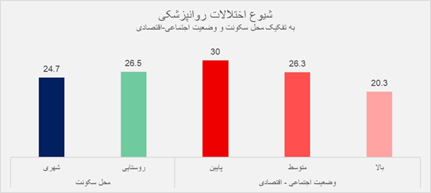 در سال 1400 شیوع اختلالات روانپزشکی در مناطق روستایی کمی بیشتر از مناطق شهری است. اما در بین افراد با وضعیت اجتماعی–اقتصادی، گروههای پایین درآمدی، ۱۰درصد بیشتر از گروههایی با وضعیت اجتماعی–اقتصادی بالا مبتلا به اختلال هستند. شیوع اختلالات روانپزشکی به تفکیک محل سکونت و وضعیت اجتماعی–اقتصادی در پیمایش سال 1390 گزارش نشده است. بر اساس نتایج پیمایش ملی سلامت روان در سال 1401، شیوع اختلالات روانپزشکی در ایران بیشتر از 25درصد برآورده شده است. بهعبارتدیگر از هر چهار نفر، یک نفر به یکی از اختلالات روانپزشکی مبتلا هستند که نشاندهنده شیوع نسبتاً بالای این اختلالات در کشور است. همچنین شیوع اختلالات روانپزشکی در زنان، مناطق روستایی و افراد با وضعیت اجتماعی–اقتصادی پایین، بالاتر است.