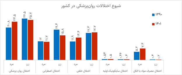 در سالهای 1390 و 1400 به ترتیب 6/23 و 1/25 درصد از جمعیت 15 تا 64 سال کشور دچار یکی از انواع اختلالات روانپزشکی بودند. در بین اختلالات روانپزشکی در سال 1400، بیشترین شیوع به ترتیب مربوط به اختلالات خلقی و سپس اختلالات اضطرابی است.