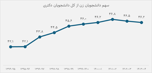 از لحاظ ترکیب جنسیتی دانشجویان دکتری، زنان با افزایشی حدوداً ۴ درصدی، ۴۶.۲ درصد کل دانشجویان را تشکیل میدهند که اگر چه این سهم افزایشیافته و به سمت برابر شدن رفته، اما توزیع جمعیتی در رشتههای مختلف از الگویی تبعیت میکند که میتواند نابرابریهای بازار کار را تشدید کند.