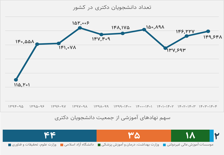 نظام آموزش عالی، در ایدهآلترین حالت، تابعی از نیازهای رشد و توسعه، ظرفیتهای بازار کار و چشماندازهای پژوهشی کشورها است. بااینحال، وضعیت دانشجویان دکتری در ایران، تصویری از یک سیستم صرفاً عرضهمحور را ترسیم میکند که در آن گویا منطق کمّیگرایی بر کیفیت و آمایش سرزمین ارجحیت دارد. بر اساس آخرین گزارش منتشر شده توسط مؤسسه پژوهش و برنامهریزی آموزش عالی در زمستان ۱۴۰۴، جمعیت دانشجویان دکتری در ایران حدود ۱۵۰ هزار نفر است.