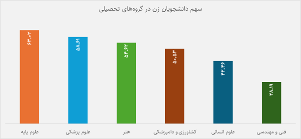 زنان در 4 گروه علوم پایه، علوم پزشکی، هنر و کشاورزی و دامپزشکی، بیش از نیمی از جمعیت دانشجویان گروه را تشکیل میدهند و این در حالی است که در گروه فنی و مهندسی، سهم زنان کمی بیش از ۲۸ درصد است. جز گروه علوم پزشکی، مابقی رشتهها بازار کار پایینتری نسبت به مشاغلی مثل گروه فنی و مهندسی دارند و به دلیل محدودیت گزارش منتشر شده به توزیع جمعیت در گروه اصلی رشته نمیتوان به این سؤال پاسخ داد که برای مثال توزیع جمعیت دانشجویان زن در رشتههای پزشکی بالاتر است یا رشتههایی که سطوح درآمدی پایینتری دارند؛ اما در نگاهی بر واقعیتهای بازار کار ایران میتوان برداشتهایی داشت. از آن جمله که تسلط زنان بر علوم پایه که در ایران بازار کار غیردانشگاهی محدودی دارد، در مقابل حضور کمرنگ در مهندسی، میتواند به معنای هدایت نخبگان زن به سمتی باشد که منتهی به بیکاری یا اشتغال با درآمد پایین شود. بهعبارتدیگر، نظام آموزش عالی اگرچه در دسترسی به عدالت جنسیتی نزدیک شده، اما در هدایت تحصیلی متناسب با فرصتهای شغلی، زنان را به حاشیه رانده است. همچنین، نرخ اشتغال پایینتر و ماندگاری تحصیلی کمتر در میان زنان دکتری، نشاندهنده اتلاف منابع انسانی متخصص در این بخش است