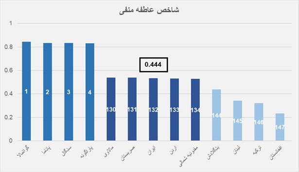 در مقابل، ایران در شاخص عاطفهٔ منفی مقدار ۰٫۴۴۴ دارد و رتبهٔ ۹ را به خود اختصاص داده است؛ جایگاهی که از بالابودن تجربهٔ احساسات ناخوشایند در زندگی روزمره حکایت میکند.