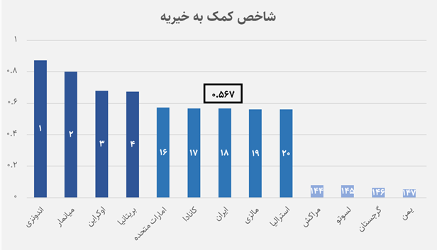 بر اساس میانگین سالهای ۲۰۲۲ تا ۲۰۲۴، ایران در شاخص کمک به غریبه با مقدار ۰٫۶۹۵ در رتبهٔ ۲۹ قرار گرفته است؛ جایگاهی که نشان میدهد کمکرسانی فردی و موقعیتی به دیگران، دستکم در سطح گزارششده، نسبتاً پررنگ است. همانطور که در گزارش نخست نیز اشاره شد، ایران در شاخص اهدا به خیریه مقدار ۰٫۵۶۷ و رتبهٔ ۱۸ را دارد؛ یعنی سهم قابلتوجهی از پاسخدهندگان گفتهاند در ماه گذشته کمک مالی خیریه داشتهاند. در مقابل، وضعیت در شاخص داوطلبی متفاوت است: مقدار ایران ۰٫۱۴۴ و رتبهٔ آن ۱۱۷ گزارش شده که به مشارکت داوطلبانه کمتر در قالبهای رسمیتر و سازمانیافتهتر اشاره دارد.