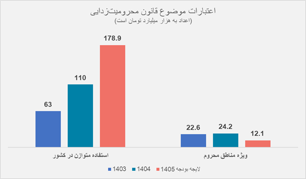 در لایحه بودجه 1405 عمده اعتبارات محرومیتزدایی ذیل ۳ بخش قانون استفاده متوازن از امکانات کشور، سهم مناطق محروم از درآمد نفت و گاز و مسکن محرومین تأمین و توزیع میشود که 199.1 هزار میلیارد تومان است و معادل 94 درصد کل اعتبارات این حوزه را شامل میگردد. در ادامه ۲ مورد اول که ۹۰ درصد این عدد را شامل میشوند، بررسی میشوند.