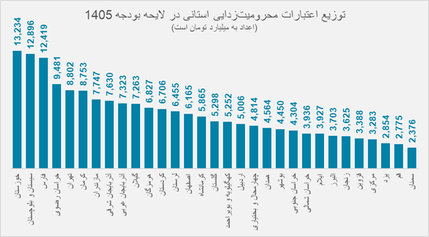 اعتبارات استانها نسبت به سال قبل ۶۵ درصد افزایشیافته است و خوزستان با 13.2، سیستان و بلوچستان 12.9 و فارس 12.4 هزار میلیارد تومان در صدر قرار دارند، سمنان، قم و یزد با 2.3، 2.7 و 2.8 هزار میلیارد تومان کمترین سهم را دریافت کردهاند. در این الگوی توزیع با مسئله بهروز نبودن شاخصها و دادههای تشخیص مناطق محروم مواجه هستیم. شاخصهای محرومیتزدایی مرجع مربوط به سال 1388 است و با شاخصهای آن سال حدود 76درصد مساحت کشور بهعنوان منطقه محروم محسوب میشود. با شاخصهای جدید این عدد به 46 درصد رسیده است.